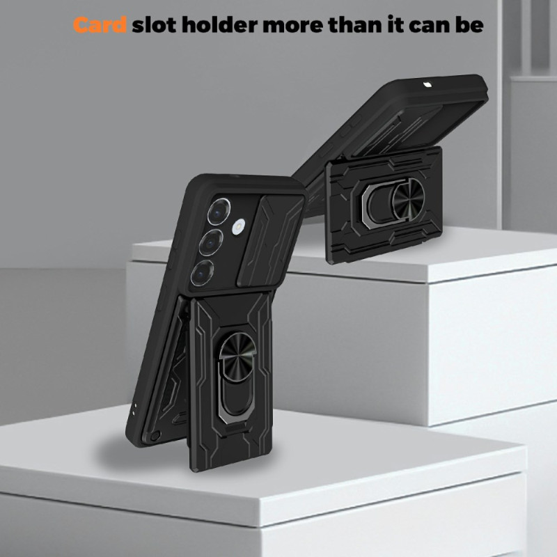 Proteja o seu Samsung Galaxy A57 5G com esta capa multifuncional que inclui um suporte metálico dobrável, um suporte para cartões integrado e uma proteção deslizante para a câmara. Compatível com suportes magnéticos para automóvel.