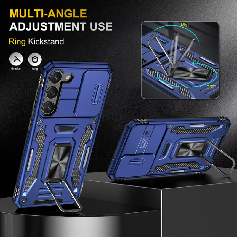Um capa para Samsung Galaxy S23 Plus 5G que vem com um película protectora de câmara deslizante e suporte mãos-livres.