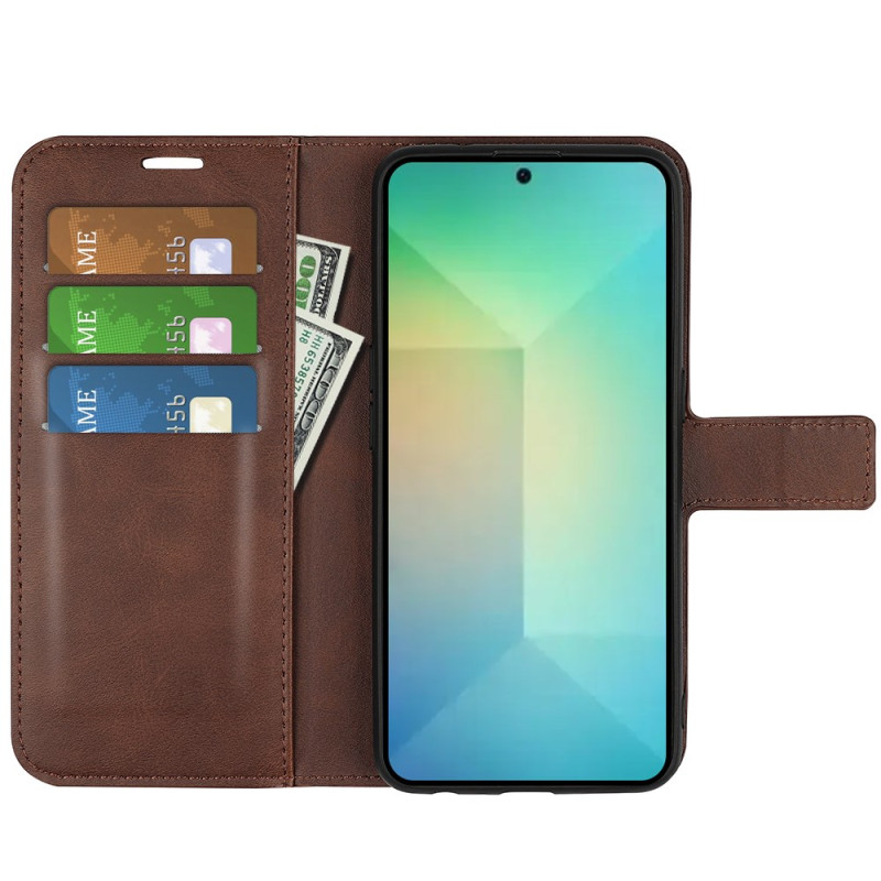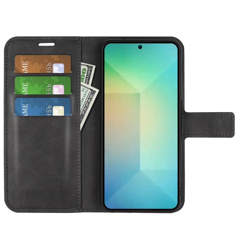 O seu design prático inclui uma carteira com 3 ranhuras para cartões e um compartimento para notas, bem como um suporte dobrável para uma visualização confortável.