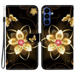Capa elegante para carteira com motivos florais dourados para Samsung Galaxy S26 5G. Design de aba com função de suporte, armazenamento de cartões e alça de mão amovível. Proteção completa com fecho magnético seguro para o seu telemóvel.