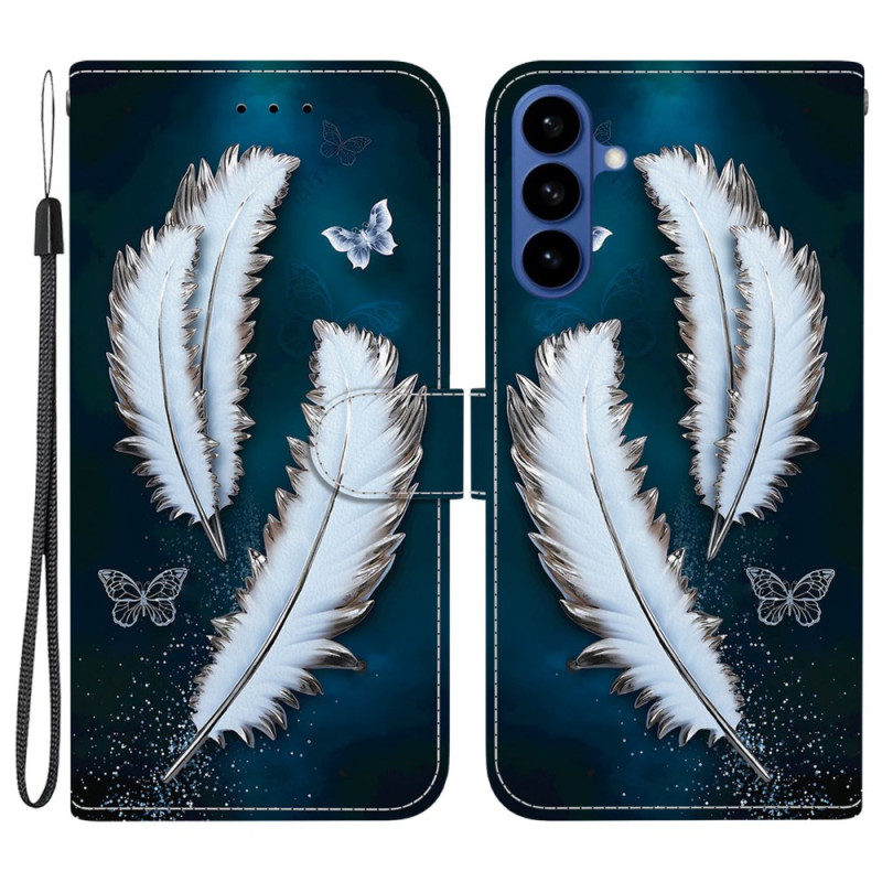 Capa elegante para carteira para Samsung Galaxy S26 com motivos de borboletas brancas e penas. Inclui ranhuras para cartões, fecho magnético seguro, função de suporte e alça amovível. Óptima proteção contra choques e riscos.