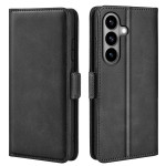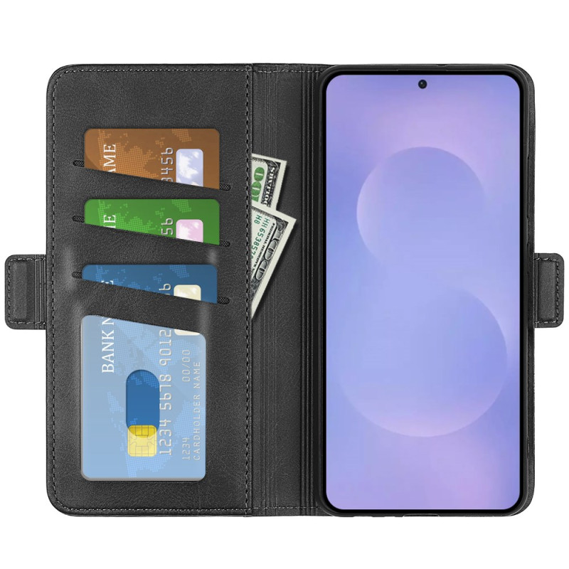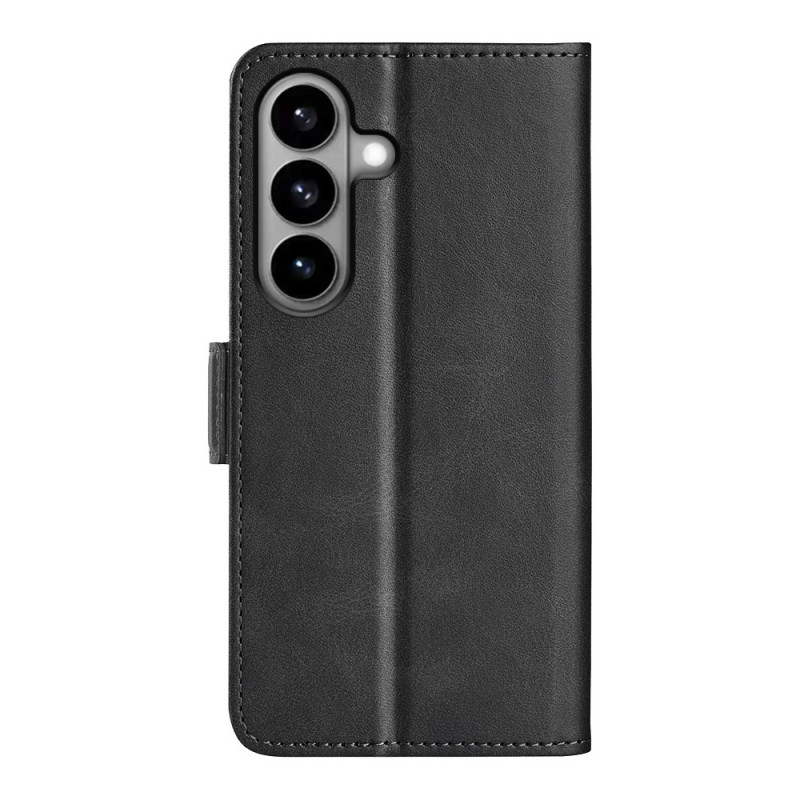 Proteja o seu Samsung Galaxy S26 com estilo com esta capa para carteira em pele PU com textura de vitela. Design prático tudo-em-um com ranhuras para cartões, bolso para dinheiro e função mãos-livres ajustável.