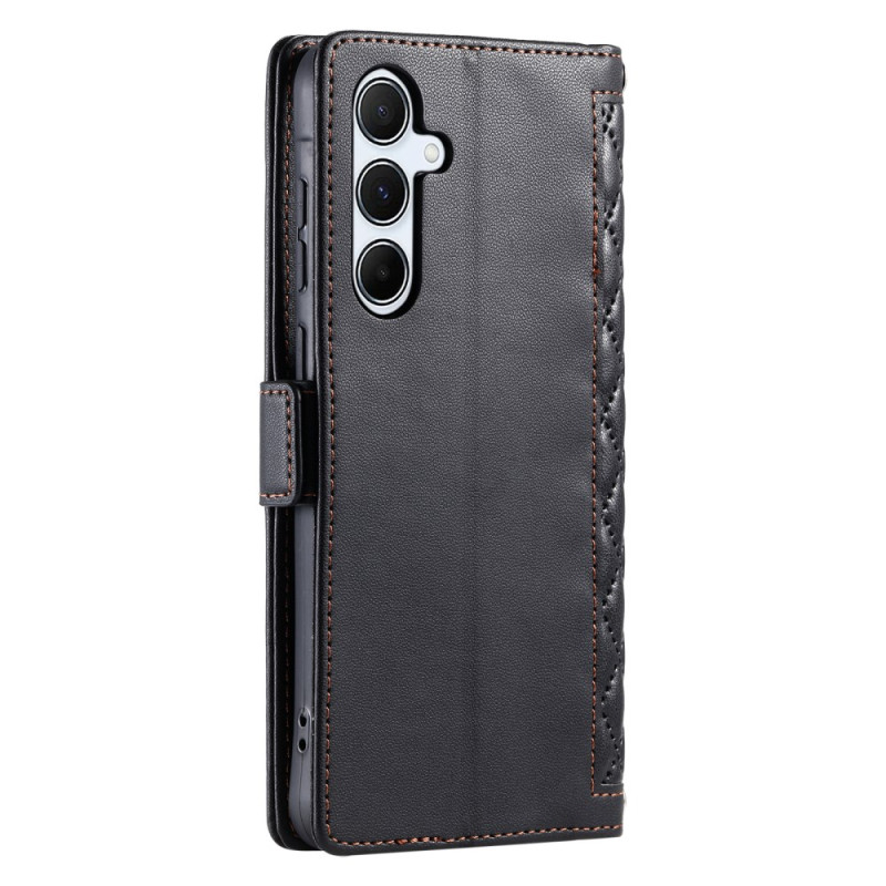 Capa elegante com textura de diamante para Samsung Galaxy S26 Plus 5G. Inclui 3 ranhuras para cartões, 1 bolso para dinheiro e uma prática alça de mão. Função mãos-livres integrada para uma visualização confortável.