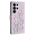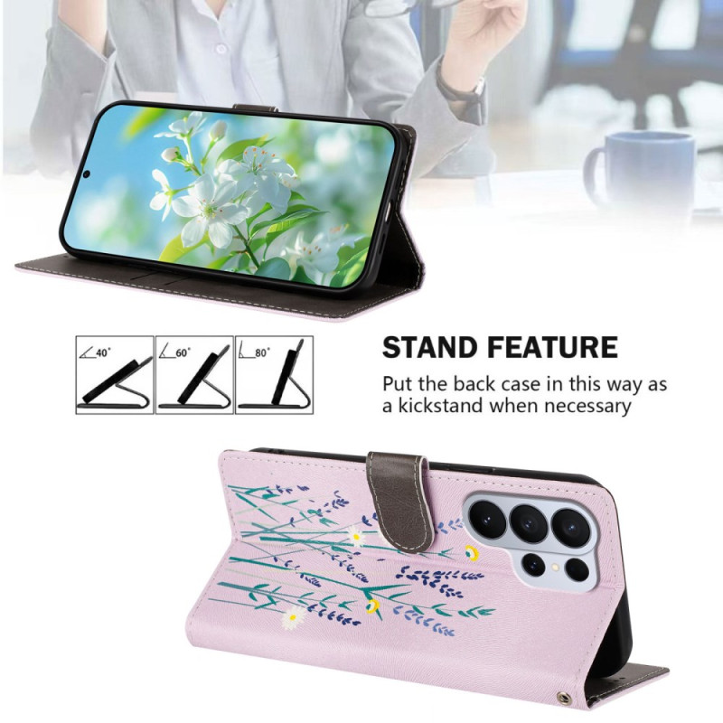 Proteja o seu Samsung Galaxy S26 Ultra com estilo com esta capa de couro lavanda. Design requintado com motivos impressos, capa em TPU resistente aos choques, suporte ajustável e alça de mão amovível para uma utilização prática no dia a dia.