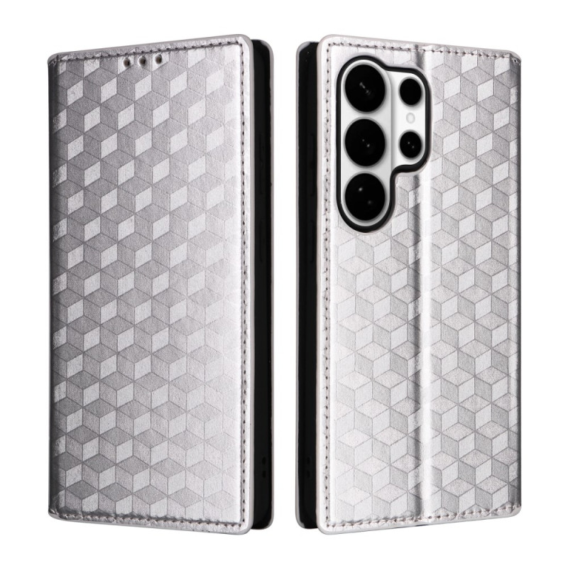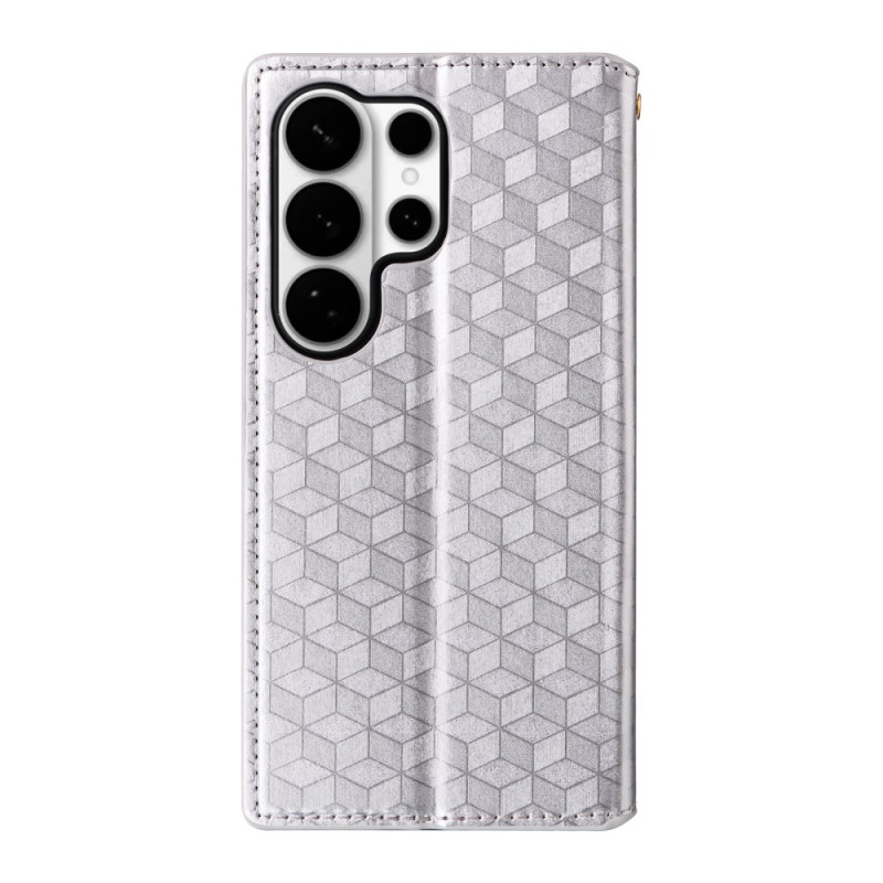Capa elegante em pele PU com padrão de diamante 3D para Samsung Galaxy S26 Ultra. Com 2 ranhuras para cartões, 1 compartimento para notas e função mãos-livres. Fecho magnético seguro e proteção total de 360°.