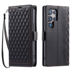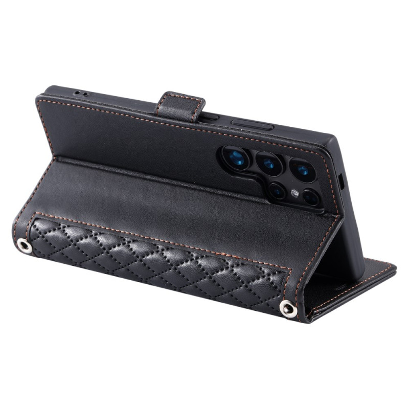 Capa elegante com textura de diamante para Samsung Galaxy S26 Ultra. Com 3 ranhuras para cartões, 1 compartimento para dinheiro e uma prática alça de mão. Suporte de visualização integrado para uma utilização óptima com as mãos livres.