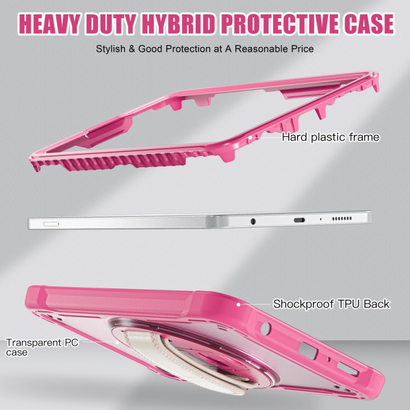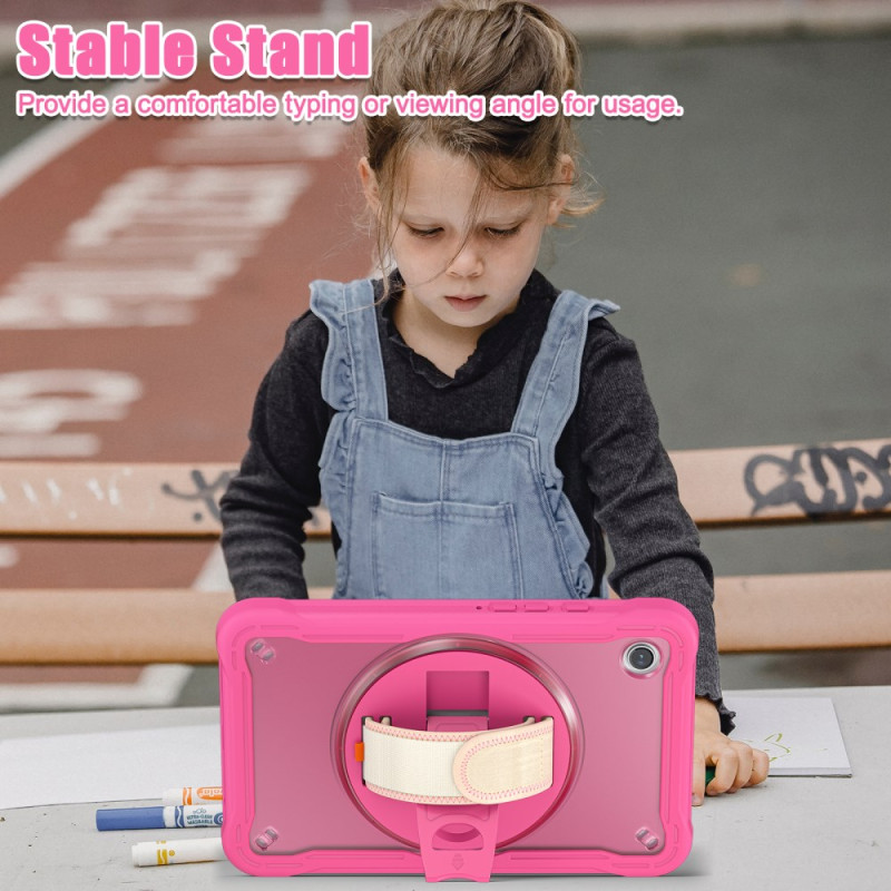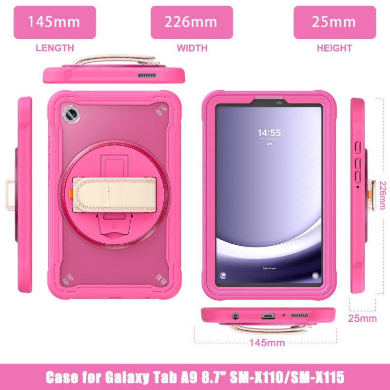 Esta capa para o tablet Samsung Galaxy Tab A9 foi concebida com um suporte rotativo de 360 graus e uma alça de mão.