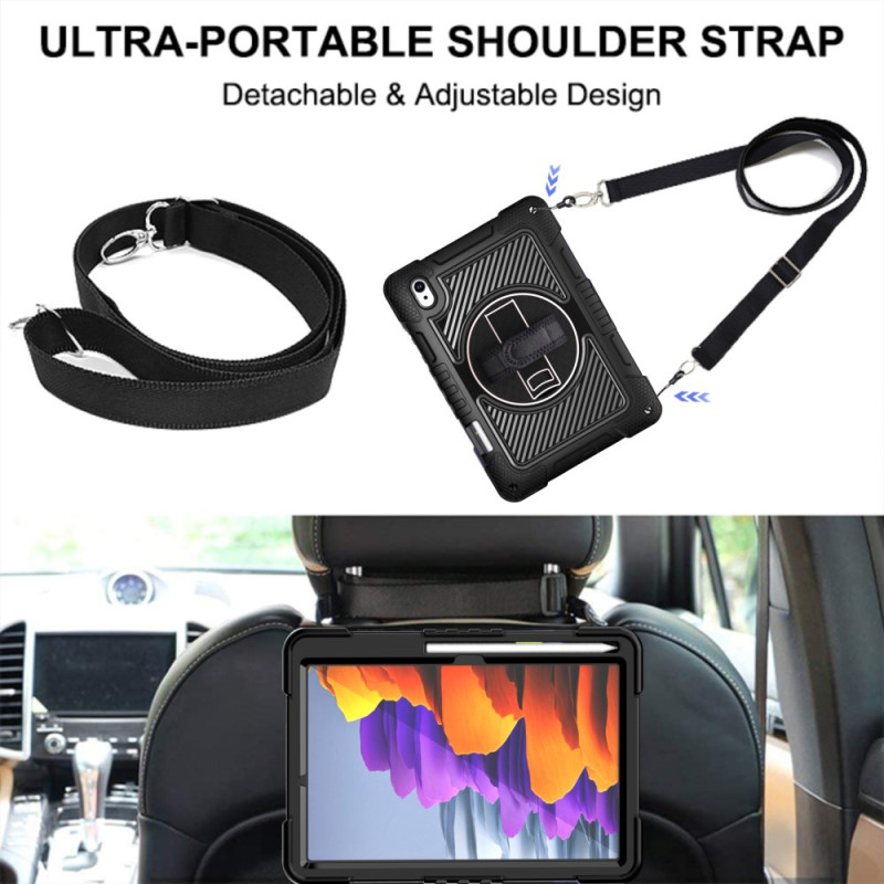 Descubra a nossa capa robusta e versátil para o Samsung Galaxy Tab S11. Fabricada em silicone não tóxico e PC, oferece uma proteção óptima contra choques e quedas. O seu suporte rotativo de 360 graus e a alça de mão ajustável garantem o máximo conforto de utilização.