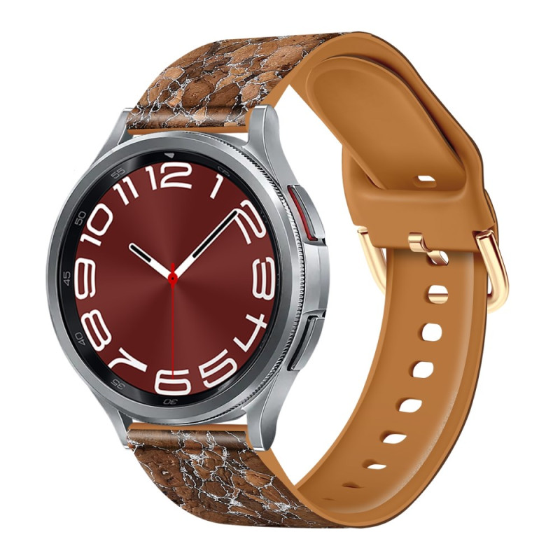 Descubra a nossa bracelete elegante e duradoura para o seu Samsung Galaxy Watch6. Fabricada em pele de madeira verdadeira e TPE antibacteriano, oferece um estilo único com a sua textura de madeira viva.