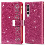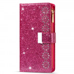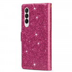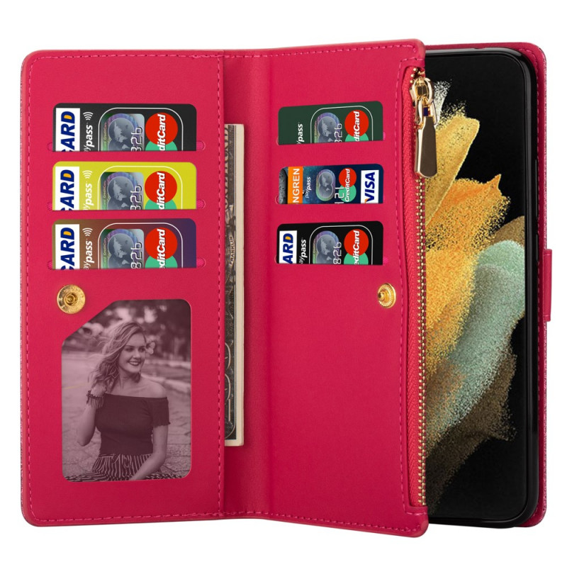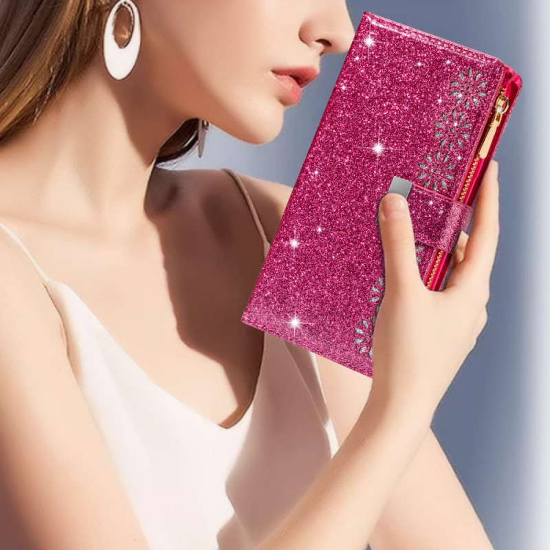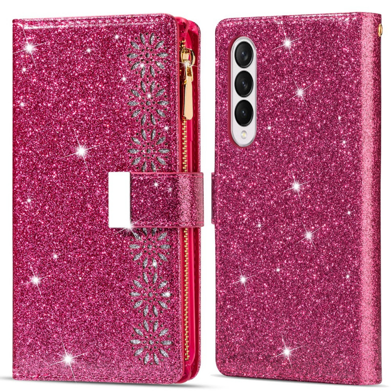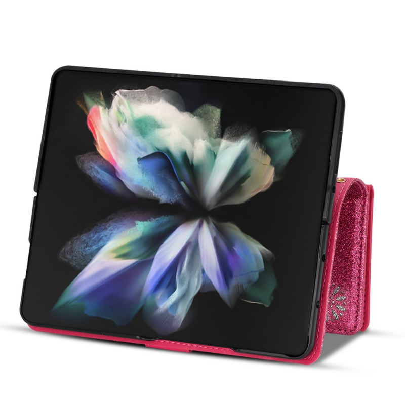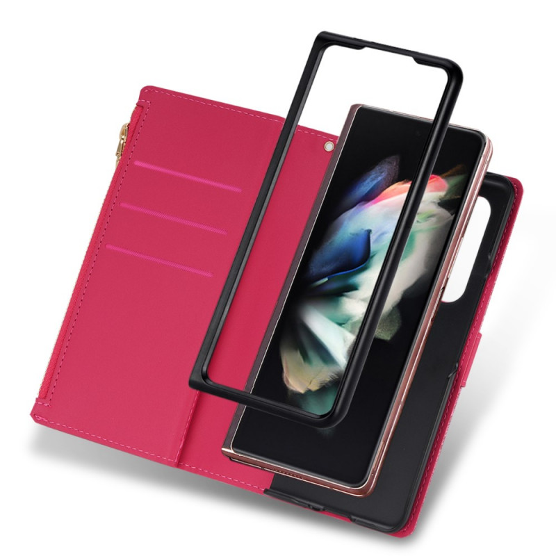 Uma grande tampa brilhante para o Samsung Galaxy Z Fold 3 5G com vários suportes de cartões e um bolso com fecho de correr para guardar trocos ou como saco de brinde.