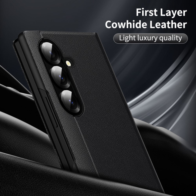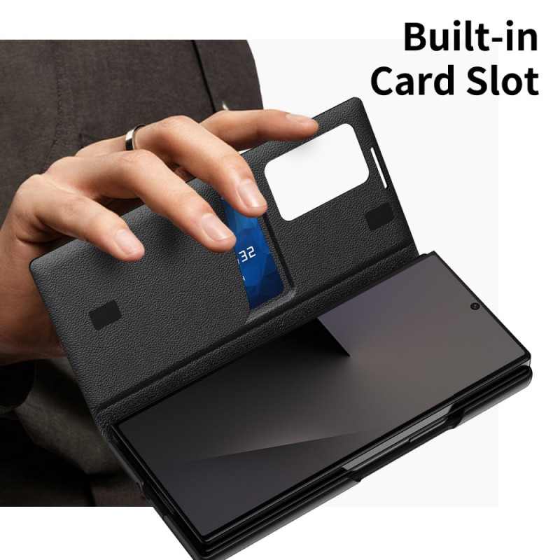 Descubra a nossa elegante capa em pele para o Samsung Galaxy Z Fold 7 5G. Com uma janela inteligente para acesso rápido, um prático suporte para cartões e uma função de suporte, combina funcionalidade e proteção.