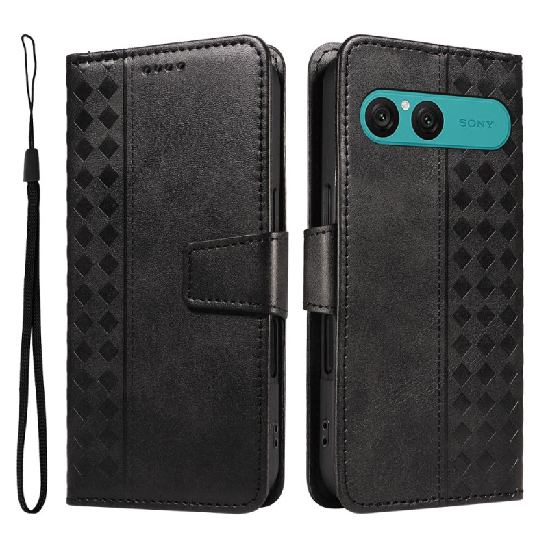 Capa elegante em pele PU com padrão de grelha para o Sony Xperia 10 VII. Múltiplas funções, incluindo suporte para cartões, bolso para bilhetes, suporte para visualização em mãos livres e alça de mão amovível. Oferece proteção completa com o seu interior em TPU que absorve os choques.