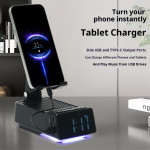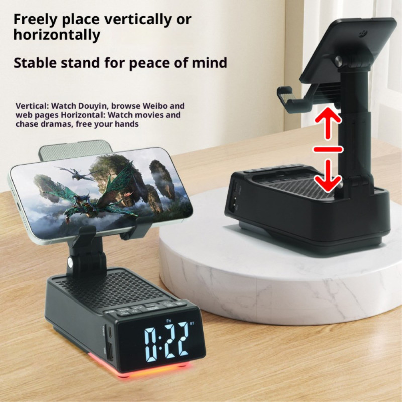 A convergência especializada de iluminação, gestão do tempo e entretenimento áudio define este dispositivo multifuncional. Esta estação 4 em 1 incorpora um altifalante Bluetooth 5.1 para um som rico a 360° e um relógio digital com dois alarmes. O seu suporte é ajustável em 180 graus, permitindo uma visualização ergonómica nos modos retrato e paisagem. A iluminação ambiente oferece sete modos dinâmicos (gradiente, respiração, cores fixas), criando uma atmosfera relaxante. A bateria integrada de 2000mAh proporciona até 4 horas de reprodução contínua sem fios.
