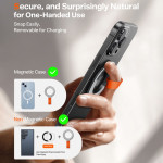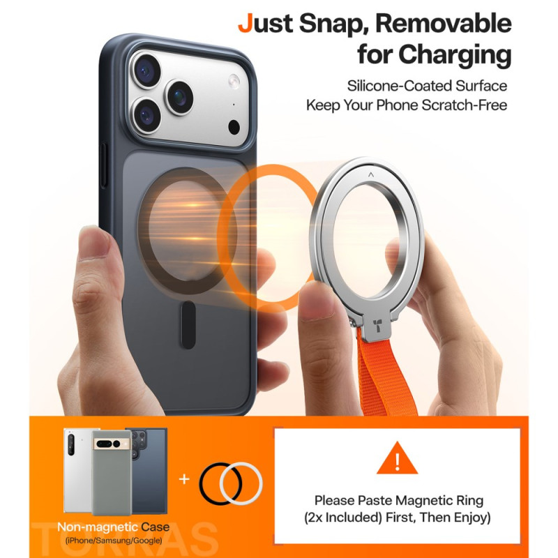 Assegurar uma aderência segura e um posicionamento mãos-livres são as principais funções deste anel magnético TORRAS. Fabricado em aço inoxidável com uma pega de nylon confortável, reduz significativamente o risco de deixar cair o dispositivo. O mecanismo incorpora ímanes potentes para uma fixação segura e instantânea em invólucros ou dispositivos compatíveis com MagSafe. O anel roda 360 graus, permitindo-lhe ajustar o ângulo de visualização para ver vídeos ou tirar selfies. O seu design dobrável torna-o ideal para guardar no bolso sem ocupar muito espaço.