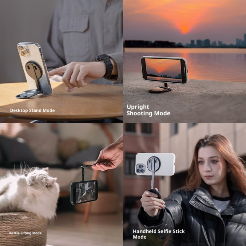 A flexibilidade de um acessório capaz de mudar instantaneamente do modo selfie para o modo de suporte de secretária é a marca registada deste suporte magnético MagFlex da PGYTECH. A sua construção em liga de alta qualidade garante uma estrutura leve, duradoura e estável. O poderoso sistema magnético garante uma fixação segura e sem esforço aos dispositivos MagSafe. O acessório foi concebido para uma conversão multifuncional rápida (pega, suporte de mesa, ângulo baixo). A pega ergonómica reduz a fadiga durante uma utilização prolongada. Este suporte é uma ferramenta essencial para criadores de conteúdos e profissionais de videoconferência.