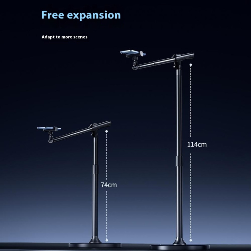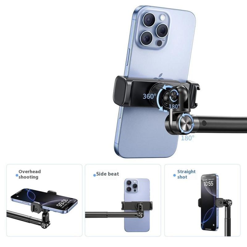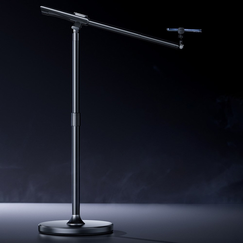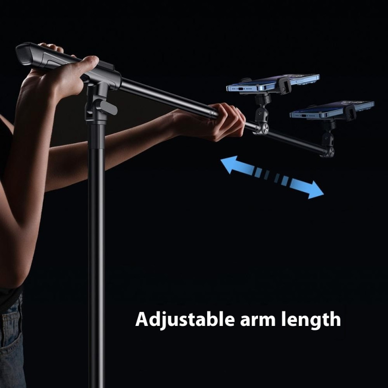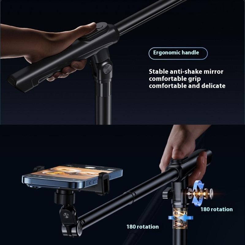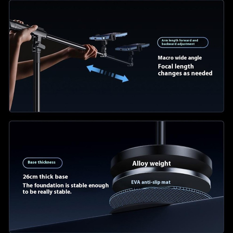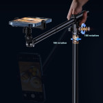 Suporte profissional ajustável para smartphone com braço panorâmico de 360°, base estável de 26 cm e ajuste vertical/horizontal de 180°. Perfeito para transmissão em direto, criação de conteúdos e vídeo. Compatível com smartphones até 6,7". Interface para acessórios incluída.