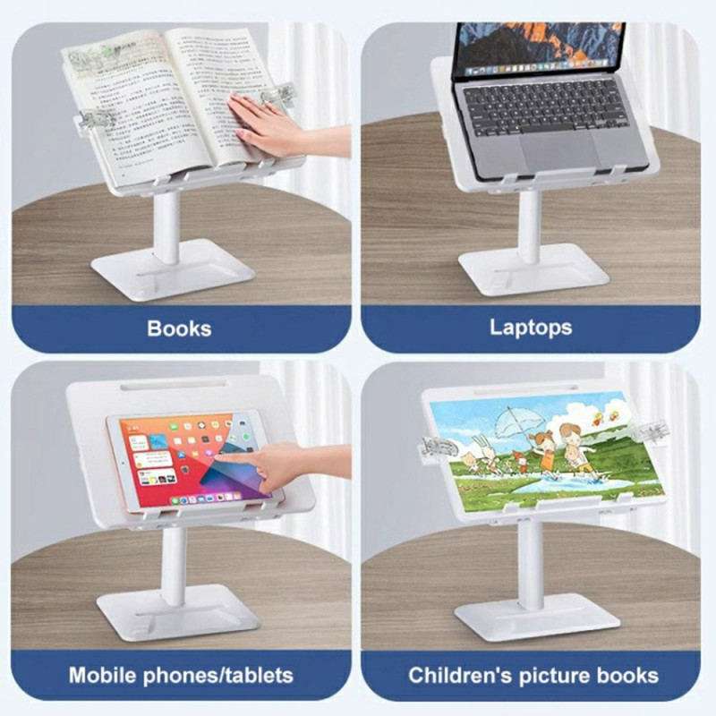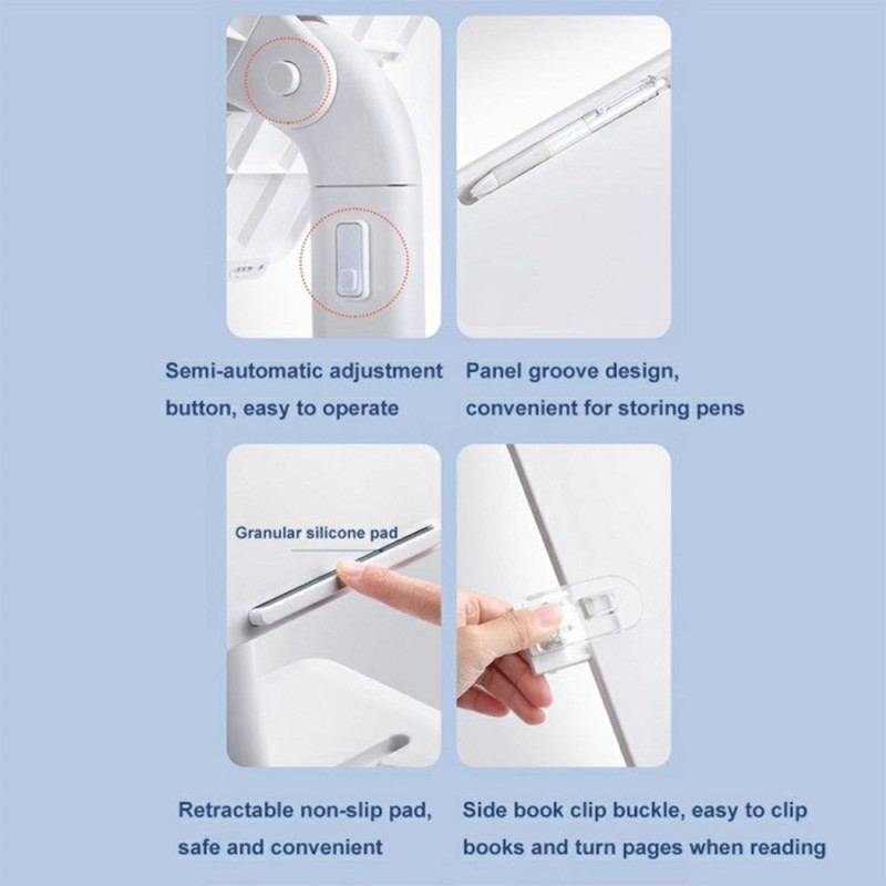 Este suporte de leitura para crianças é a solução ergonómica ideal para promover uma postura correta durante o estudo ou a leitura. Graças à sua estrutura reforçada, proporciona uma excelente estabilidade sem oscilar. O seu sistema de regulação semi-automático permite ajustar o ângulo rapidamente e sem esforço, enquanto a sua altura telescópica se adapta a crianças de diferentes idades. A placa basculante pode ser transformada numa superfície plana para ser utilizada como uma pequena secretária. Leve e fácil de montar, inclui uma ranhura para suporte de canetas e clipes laterais antideslizantes para manter os livros e os materiais em segurança no lugar.