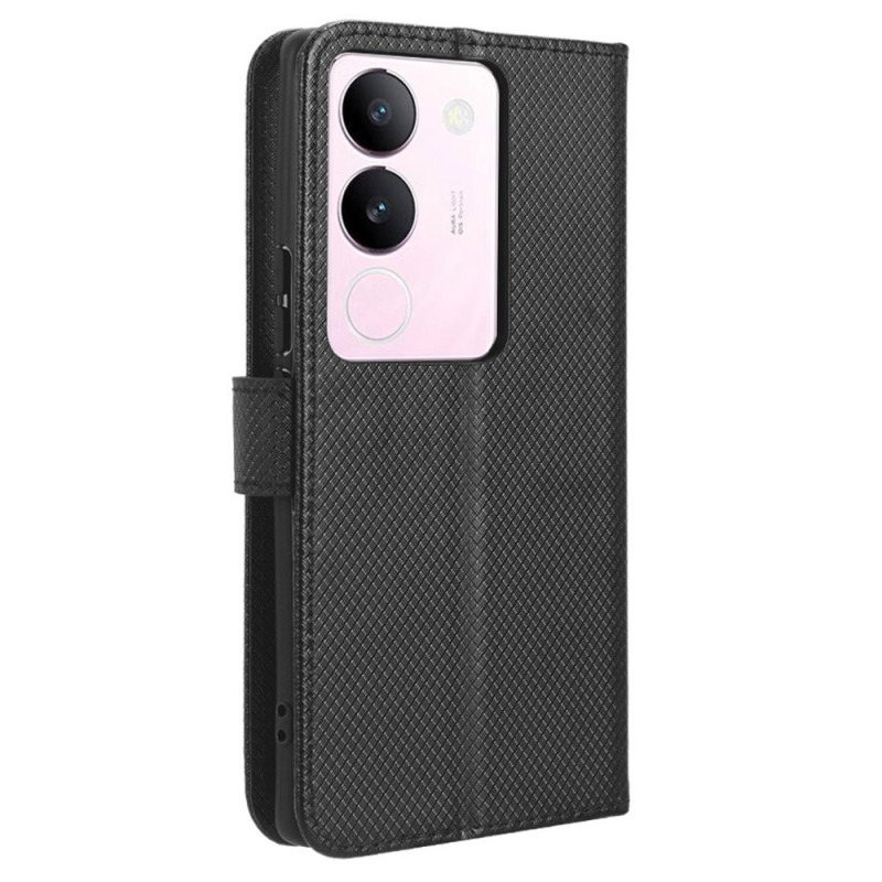 Capa elegante com textura de diamante para o Vivo V29 5G. Inclui ranhuras para cartões, bolso para dinheiro e suporte dobrável integrado. Fecho magnético seguro e alça de mão incluída para facilitar o transporte.