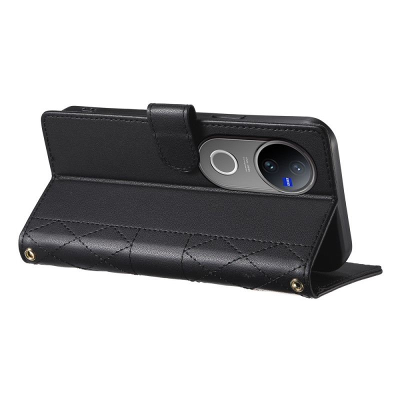 Capa de carteira elegante para o Vivo V50 5G com um sofisticado design acolchoado com diamantes. Inclui 3 ranhuras para cartões, 1 bolso para dinheiro, função de suporte integrada e alças de ombro amovíveis. Proteção completa contra choques e riscos.