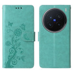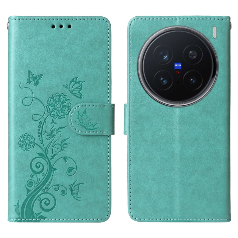 Capa elegante em pele para o Vivo X200 Pro 5G com estampado floral e borboleta. Inclui um suporte integrado, ranhuras para cartões e um compartimento para a carteira. Proteção completa com uma prática correia de mão para um transporte fácil.