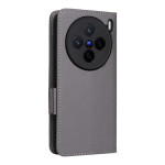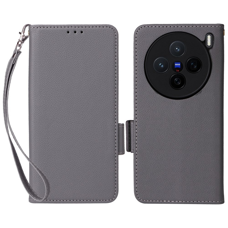 Capa elegante em pele PU com textura de lichia para o Vivo X200 5G. Inclui ranhuras para cartões, suporte para mãos livres e uma prática alça de mão. Proteção completa com fecho magnético seguro para uma utilização diária ideal.