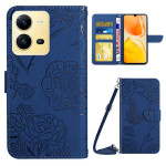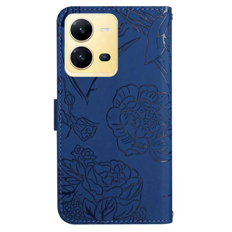 Capa de carteira elegante com borboletas e flores em relevo para o Vivo X80 Lite 5G. Proteção total contra impactos, suporte ajustável, compartimentos para cartões e alça para o ombro incluídos. Fecho magnético seguro.