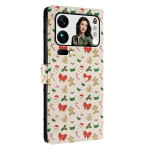 Capa tipo carteira elegante para o Xiaomi 17 Pro Max com motivos festivos. Design em pele PU de alta qualidade com suporte integrado, 2 ranhuras para cartões, bolso para bilhetes e fecho magnético seguro. Inclui uma prática correia de mão.
