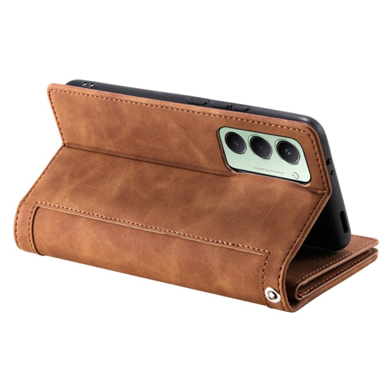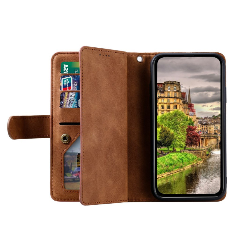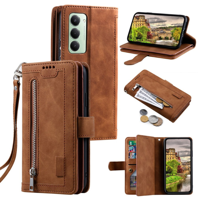 Estojo em pele PU para Xiaomi Redmi 15 com 9 ranhuras para cartões, fecho de correr e alça de mão. Função de suporte integrada para visualização em mãos-livres. Proteção completa com fecho magnético e interior em TPU. Perfeita para guardar cartões, moedas e notas em segurança.