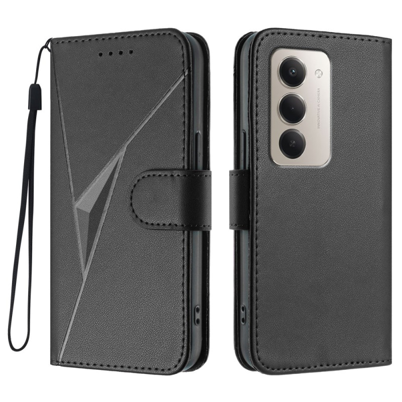 Descubra a nossa elegante capa em pele PU para o Xiaomi Redmi 15 4G / 5G. Com o seu fecho magnético, padrão triangular elegante e design clássico de carteira, oferece uma proteção completa sem deixar de ser prática. O capa tem espaço para três cartões e dinheiro, proteção contra choques e uma correia de pulso para maior segurança.