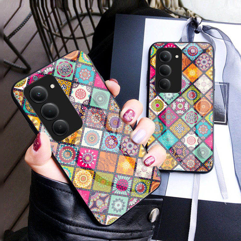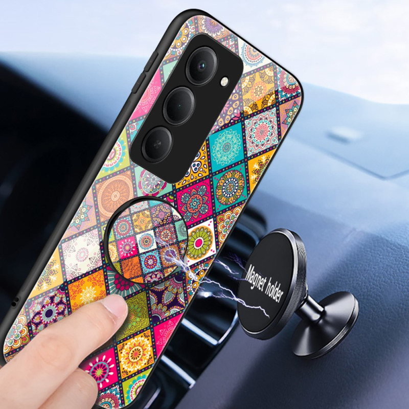 Elegante capa protetora para o Xiaomi Redmi 15 4G com motivos étnicos, vidro temperado, suporte integrado e alça de mão. Fabricada em plástico rígido e TPU macio, oferece uma proteção multicamadas. O suporte dobrável permite uma visualização sem mãos, enquanto a pega de mão facilita o transporte e evita quedas.