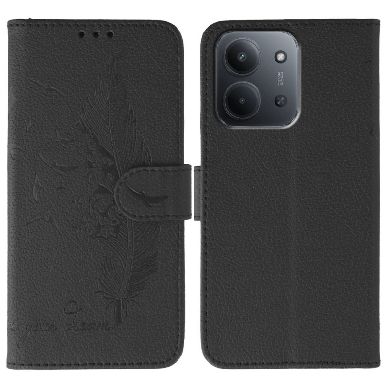 Descubra a nossa elegante capa de carteira para o Xiaomi Redmi 15C 4G / 5G. Fabricada em pele PU com textura de lichia e TPU, oferece uma aderência confortável e um aspeto luxuoso. Com o seu motivo de penas impresso, 3 ranhuras para cartões, compartimento para bilhetes e fecho magnético, esta capa combina funcionalidade com estilo. Pode também tirar partido da função de suporte ajustável para uma visualização em mãos livres.