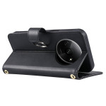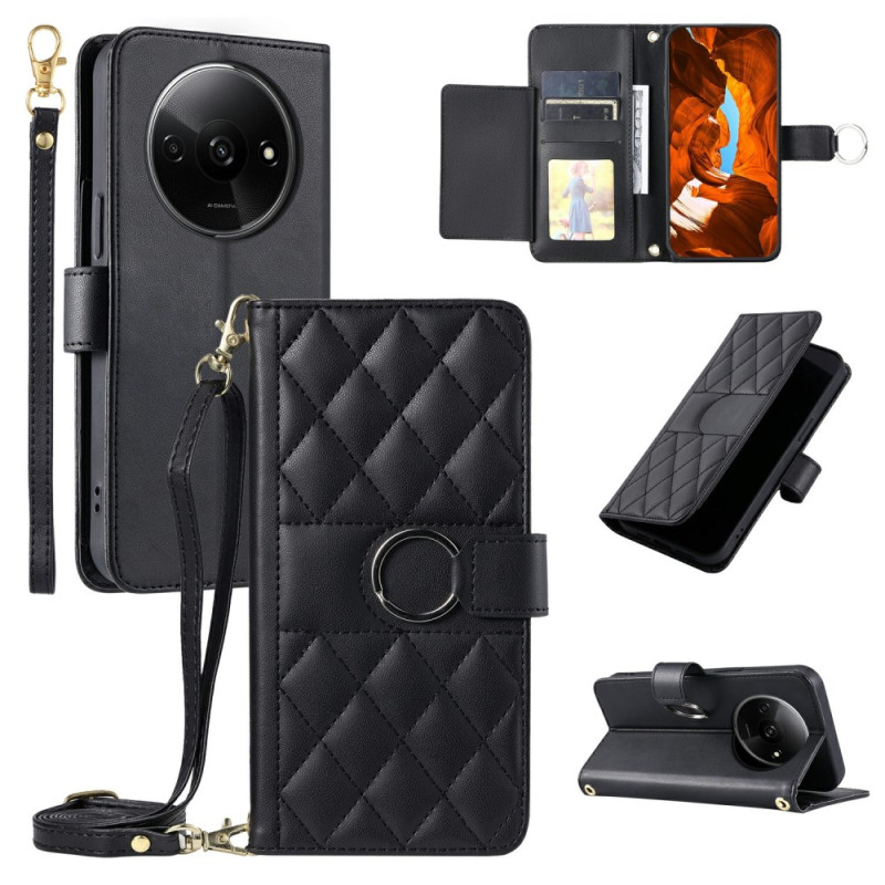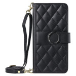 Étui portefeuille élégant en cuir PU avec design losange raffiné. Comprend 5 emplacements pour cartes, une poche à monnaie, un support pliable et deux bretelles ajustables (poignet et bandoulière). Protection complète contre les chocs et rayures.