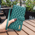 Tem um fecho de correr resistente e suportes internos para cartões.