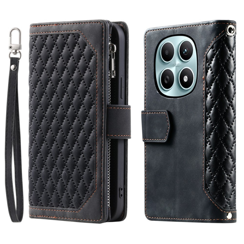 Capa elegante em pele PU com padrão de diamante para Xiaomi Redmi Note 15 4G. Multifuncional com ranhuras para cartões, bolso com fecho de correr e suporte para mãos livres. Fecho magnético seguro e correia de pulso incluída para facilitar o transporte.