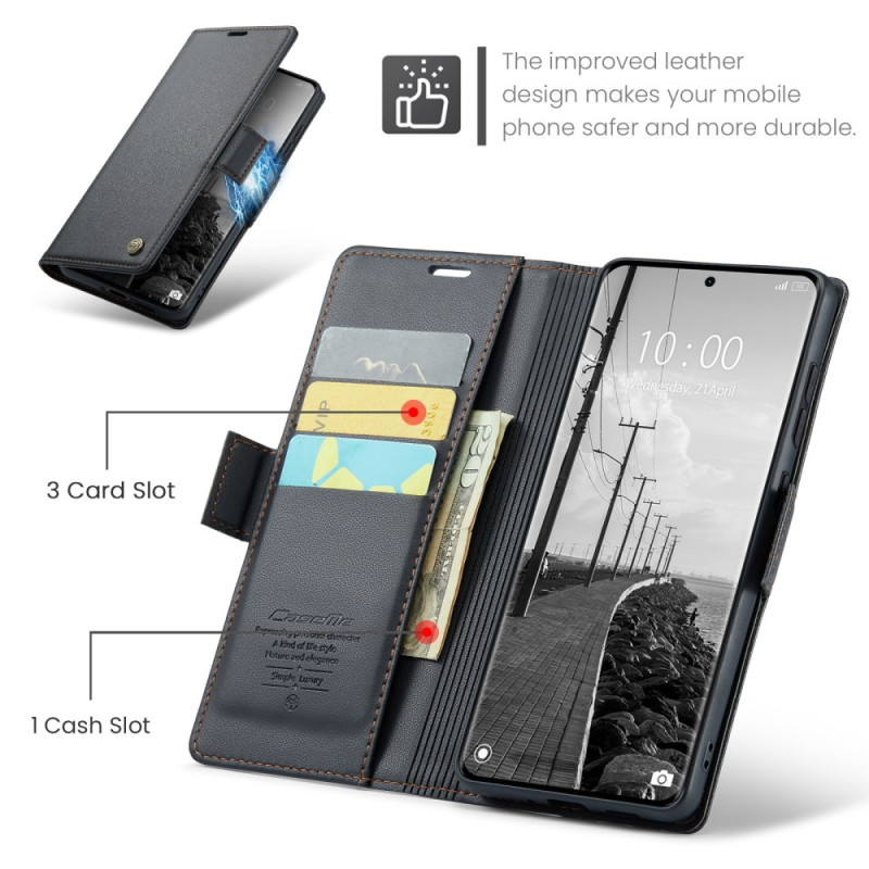 Descubra a capa para carteira CASEME que combina elegância e praticidade. Com a sua avançada proteção RFID, 3 ranhuras para cartões e suporte ajustável, esta capa em pele texturizada oferece uma proteção completa para o seu smartphone, simplificando o seu dia a dia.