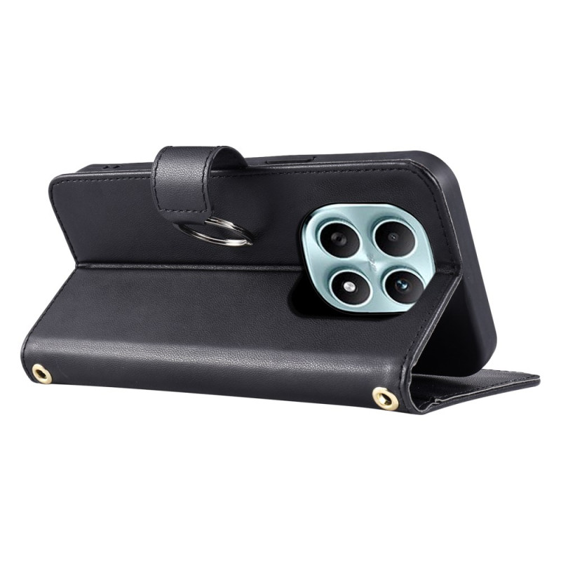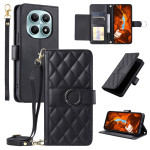 Étui portefeuille élégant en cuir PU avec motif losange sophistiqué. Comprend un anneau métallique décoratif, 5 emplacements pour cartes, une poche à monnaie et un support pliable. Livré avec deux bandoulières détachables pour port à la main ou en crossbody.