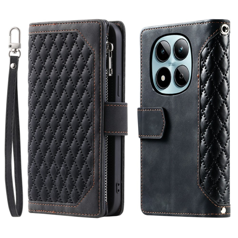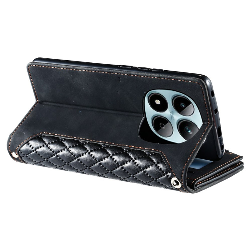 Capa de carteira elegante com padrão de diamante acolchoado para o seu Xiaomi Redmi Note 15 Pro 4G. Combina estilo e funcionalidade com múltiplas ranhuras para cartões, suporte mãos-livres e fecho magnético seguro.