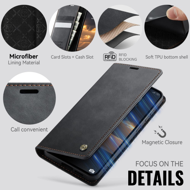 Capa de carteira elegante com proteção RFID integrada para manter os seus dados pessoais seguros. Design prático com 2 ranhuras para cartões e bolso para notas. Função de suporte ajustável para uma visualização em mãos-livres.