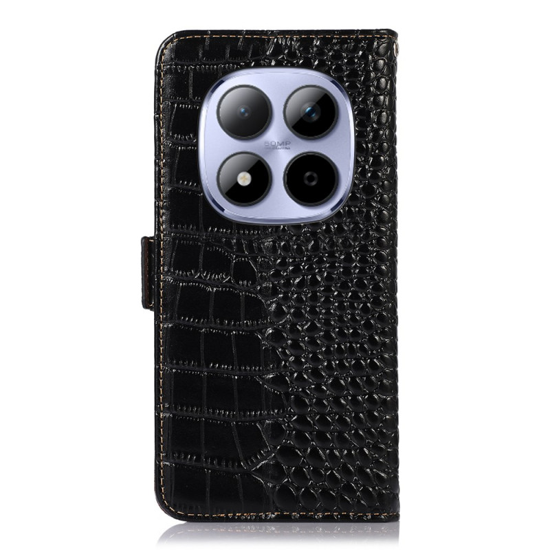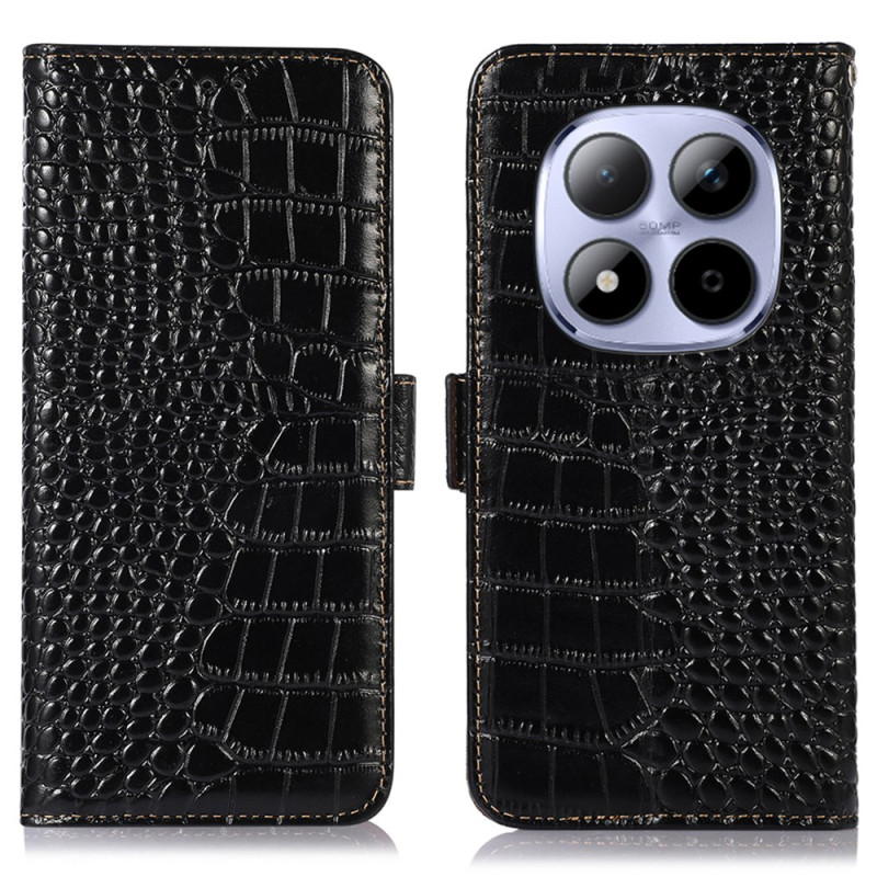 Capa elegante com textura de crocodilo para Xiaomi Redmi Note 15 Pro 4G. Proteção RFID integrada, 3 ranhuras para cartões e 1 bolso para notas. Suporte de visualização ajustável e fecho magnético duplo para uma segurança óptima.