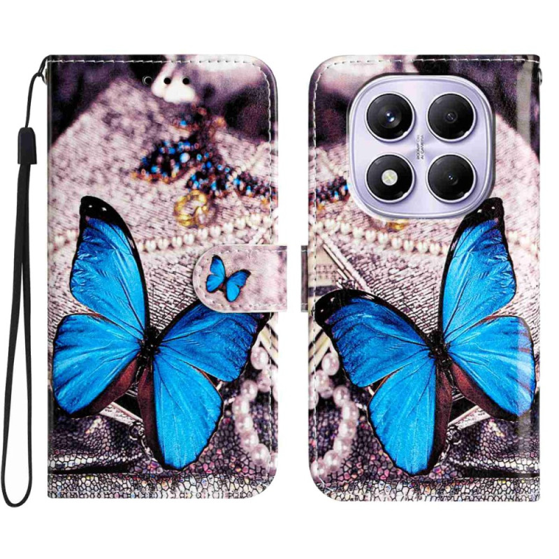 Étui portefeuille élégant avec motif papillon bleu pour Xiaomi Redmi Note 15 Pro 4G. Design sophistiqué avec 3 emplacements pour cartes, fermeture magnétique sécurisée et support multi-angles. Inclut une dragonne amovible pour un transport facile.