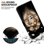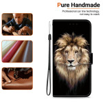 Capa de carteira elegante com impressão de cabeça de leão para Xiaomi Redmi Note 15 Pro 5G. Função de suporte integrada, fecho magnético seguro e ranhuras para cartões. Inclui um cordão amovível para um transporte fácil e cómodo.