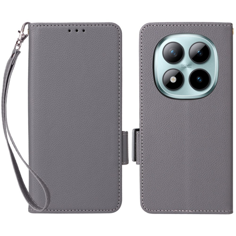 Capa elegante em pele PU com textura de lichia para Xiaomi Redmi Note 15 Pro 5G. Função mãos-livres, fecho magnético e correia de pulso incluídos. Proteja o seu telemóvel com estilo e mantenha os seus cartões essenciais sempre à mão.