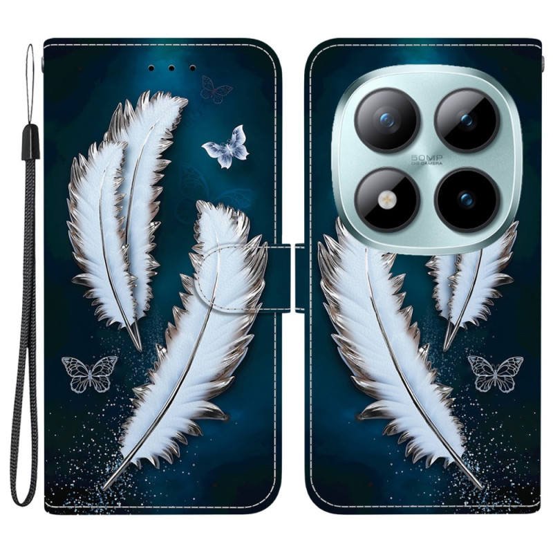 Proteja o seu Xiaomi Redmi Note 15 Pro Plus 5G com estilo com esta capa para carteira com aba. Design requintado com motivo de penas de borboleta brancas, função de suporte integrada, compartimentos para cartões e fecho magnético seguro.