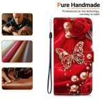 Capa elegante com suporte dobrável e alça de mão amovível para Xiaomi Redmi Note 15 Pro Plus 5G. Design sofisticado em forma de borboleta cor-de-rosa perolada. Fecho magnético seguro, 2 ranhuras para cartões e compartimento para dinheiro integrado.