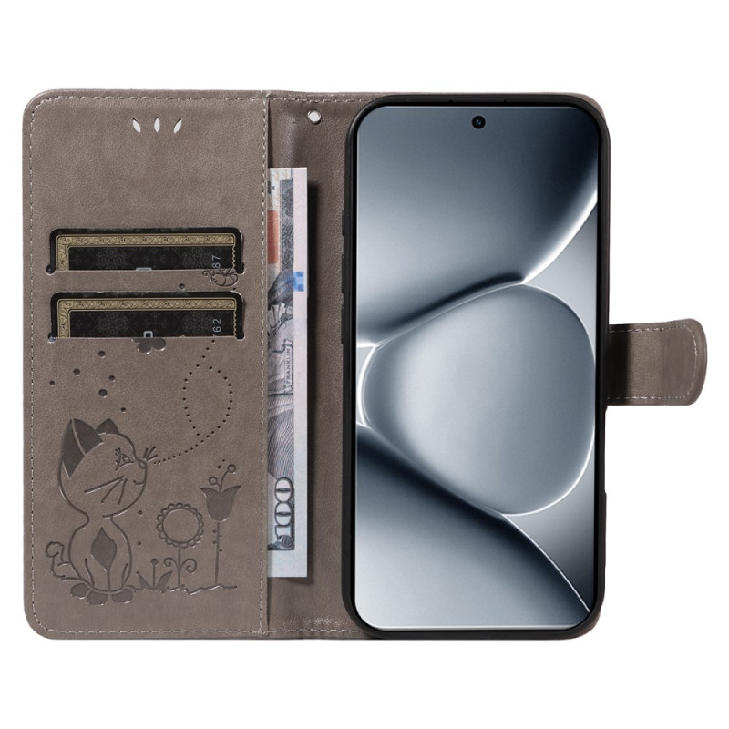 Descubra a nossa elegante capa de carteira para o Xiaomi Redmi Note 15 Pro Plus 5G. Fabricada em pele PU de primeira qualidade com um requintado design de gato e abelha, combina estilo e proteção. Com compartimentos para cartões, um suporte integrado e uma prática correia de pulso para uma utilização quotidiana ideal.