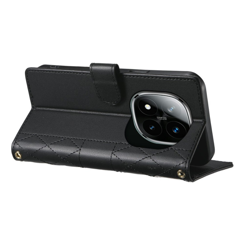 Capa elegante em pele PU com design acolchoado com diamantes para Xiaomi Redmi Note 15 Pro Plus 5G. Inclui 3 ranhuras para cartões, 1 bolso para dinheiro, função de suporte integrada e alças de ombro amovíveis (curta e longa) para uma utilização versátil.