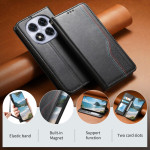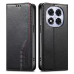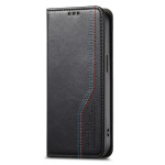 Capa elegante em pele PU com costuras tricolores para Xiaomi Redmi Note 15 Pro Plus 5G. Inclui 2 ranhuras para cartões, 1 carteira, suporte para mãos livres e fecho magnético. Fornecida com uma correia elástica lateral para uma aderência segura.